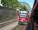 | Regio 1641 (St. Moritz - Tirano) in foreground and Regio 1656 (Tirano - St. Moritz) in background, both consisting of Allegra units with additional passenger cars, crossing at Bernina Lagalb. 2011-10-03. |