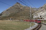 | Regio 1641 (St. Moritz - Tirano), consisting of Allegra unit and five passenger cars, between Bernina Lagalb and Ospizio Bernina, seen from the Sass Queder. 2011-10-03. |
