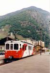 17 March 2000, Martigny, Switzerland Train connecting Martigny with Châtelard-la-Frontière. They could continue further, into France, but SNCF does not want them to, so you have to change trains to reach Chamonix and St-Gervais-les-Bains. This narrow gauge railway has a cog rail section on its steep scenic climb out of the Rhône valley and can get its current from either third rail or overhead wires.