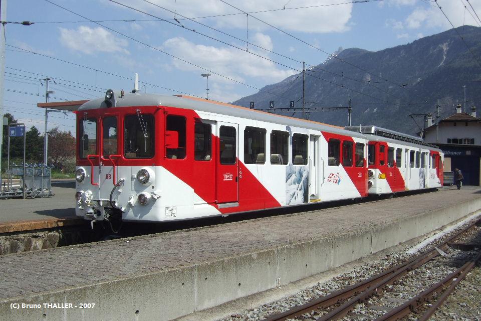 TMR (Transports de Martigny et Région) (Suisse) La voiture BDt 68 en tête d'un train Mont Blanc Express au départ de Martigny 14 avril 2007 Photo Bruno THALLER - bms.thaller@wanadoo.fr |