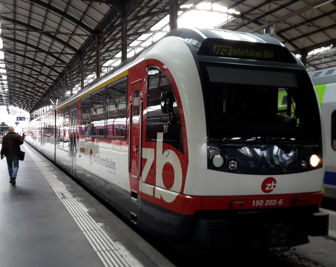 | zentralbahn ABeh 150 202-6 with IR 2928 "Luzern-Interlaken Express". These units named ADLER (Alpiner Dynamischer Leichter Eleganter Reisezug) are in service since 2012. Luzern, 2015-10-29. |
