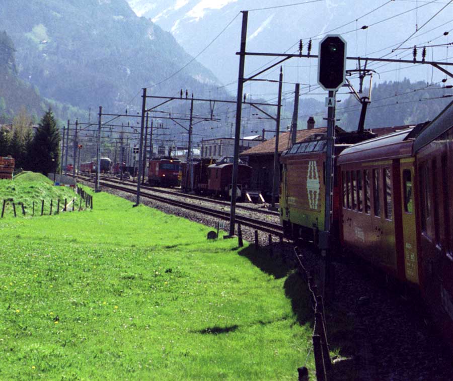 Auf der Brünigbahnstrecke zwischen dem Brünigpass und dem Bahnhof Meiringen. Einfahrt in den Bahnhof Meiringen. April 2000 Photo: A. Senn; http://www.senn.ch |