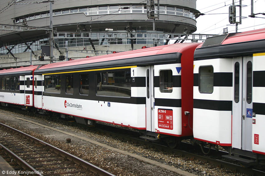 | zentralbahn A 214-0 in an InterRegio train from/to Luzern. The "zebra design" was introduced with SBB CFF FFS standard gauge panorama cars of 1991 which pioneered the curved windows. In 1994 two PA-90 panorama cars were taken into service by the SBB-Brünig with a similar design (but red above and below the window band), the modernized SIG EW I cars were painted in a matching livery. Meanwhile the panorama cars were changed to Golden Pass design (along with two matching trainsets), the rest of the IR rolling stock remains in zebra design, since the introduction of the zb 2005 the area below the windows became white (with this partial application of an adhesive a more expensive repaint could be avoided, even the inscriptions are still the old, found in a red "window"). Interlaken Ost, 2011-09-30. |