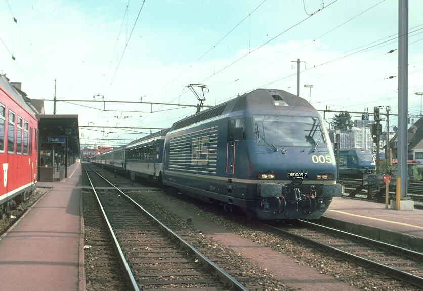 Eine Re 465 mit Personenzug auf der Südostseite des Bahnhofs Thun. Dez. 1999 Photo and scan: A. Senn; http://www.senn.ch |