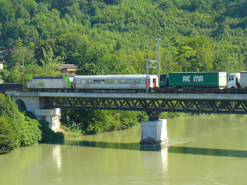 BLS AG (BLS) - Switzerland A BLS Cargo locomotive of class Re 486 (a TRAXX built by Bombardier) passes over the Aare river in Olten with a huckepack train. The passenger coach is intended for the truck drivers. Olten, 07-08-2010 Digital photo by Marco van Uden |