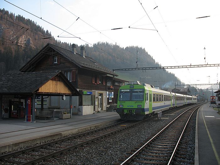 BLS local trains Spiez-Zweisimmen and Zweisimmen-Interlaken at Boltigen 8.4.2007 Martin P. |