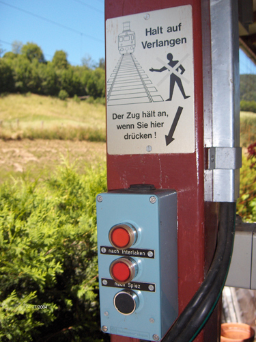Stop on request-buttons in Faulensee (near Spiez). The text on the sign is "The train stops, when you push here".