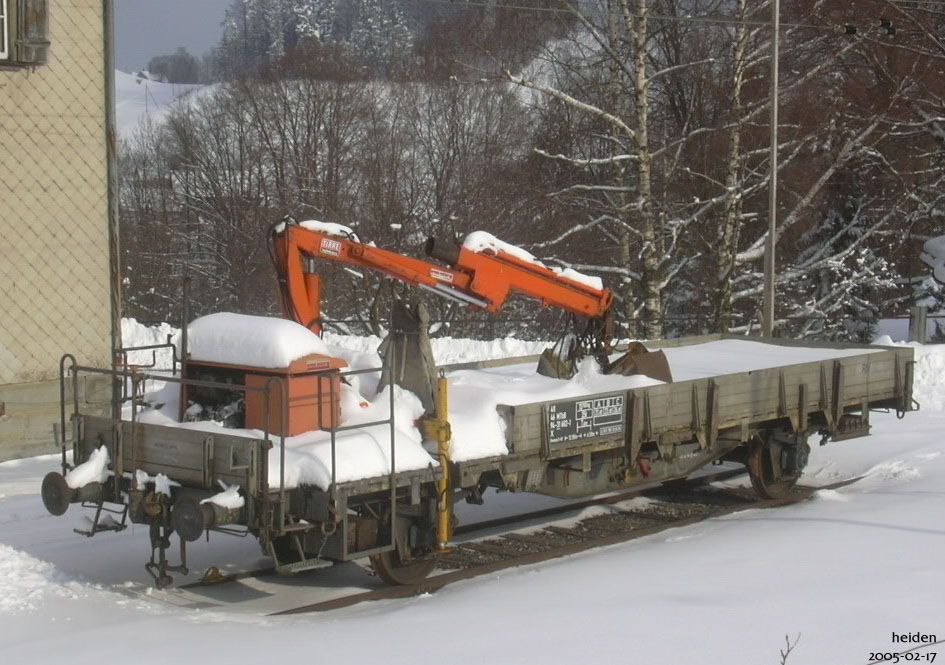 | Flat wagon with crane, according to the inscriptions belonging to the MThB, but seen at the Rorschach-Heiden-Bergbahn. Heiden, 2005-02-17. |