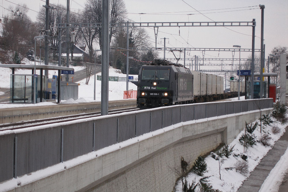 RaiL Traction Service (RTS) Locomotive E185 gare de Vauderens avec un train spécial de transport de containers. (Nouveau tunnel de Vauderens)