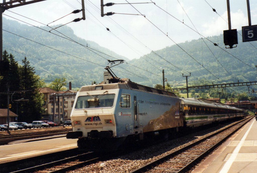 | SOB 091 mit RIGI-Werbung in Arth-Goldau, 22 Mai 2002 Scanned photo by Leon Schrijvers Leon2711schrijvers@yahoo.co.uk |