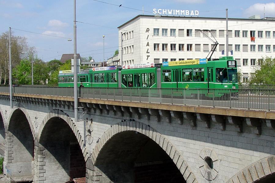 Basel - Straßenbahn - 667 Triebwagen 667 auf Linie 8 bei der Fahrt über die Mittlere Brücke kurz vor der Haltestelle Schifflände, aufgenommen am 30. März 2008.