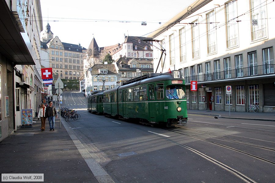 Basel - Straßenbahn - 642 Triebwagen 642 auf Linie 14 nahe der Haltestelle Bankverein am 24. Februar 2008.