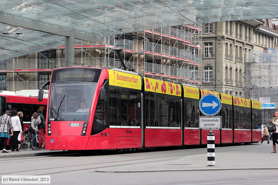 Bern - Straßenbahn - 665 Triebwagen 665 auf Linie 8 nach Brünnen Westside Bahnhof an der Haltestelle Bern Bahnhof, aufgenommen am 02. Oktober 2013.