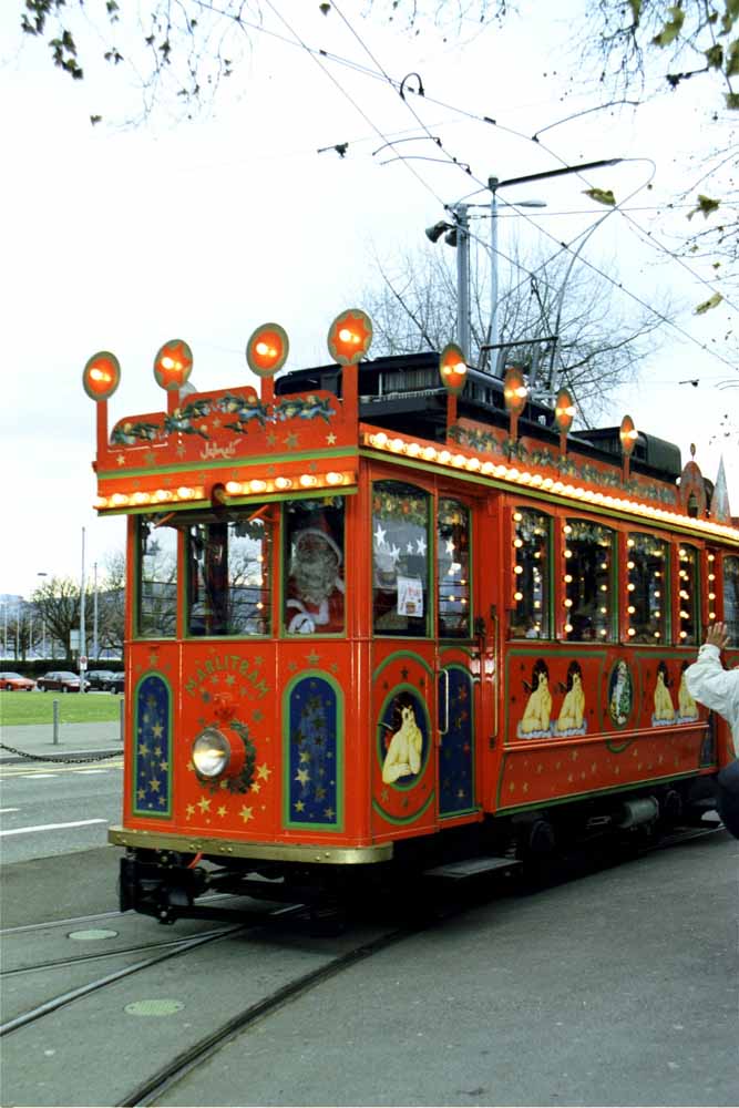 Das Märlitram von Zürich beim Bellevue unterwegs für die nächste Runde zwischen Bellevue-Central-Bahnhofsplatz-Paradeplatz-Bürkliplatz-Bellevue. Dec. 1998 Photo and scan: A. Senn; http://www.senn.ch |