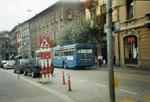 This is an older Mercedes Benz trolley bus in Lugano, Switzerland. In 2003 all trolleybusses were replaced with Citaro diesel busses, and the trolley wires were taken down although the mounts were kept. Taken 16 September 2000. © 2000, 2006 Josh Hanz (josh_hanz@hotmail.com) |