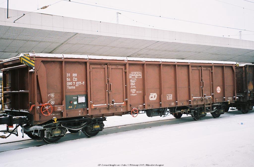 A covered freight car of the Czech Railways photographed in Bulgaria at Sofia's Central Railway Station. It is part of an international freight train headed by BDZ's electric locomotive 45 170.8. The train passed Sofia's Central and headed north towards Mezdra after waiting for a passenger train to overtake it. 3 February 2005