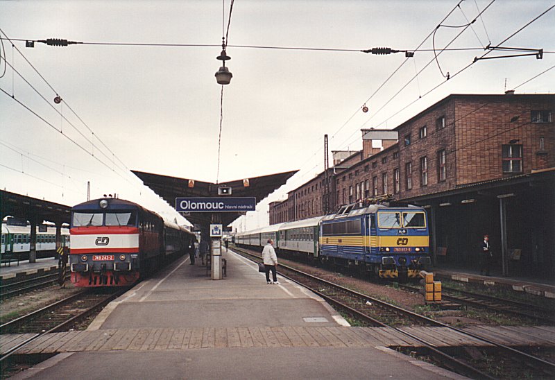 CD - Czech Republic Czech electric dual voltage locomotive 363 003 with a train to Prague, and diesel locomotive 749 243 with a train to Opava, ready to depart. Olomouc, 15 May 2001