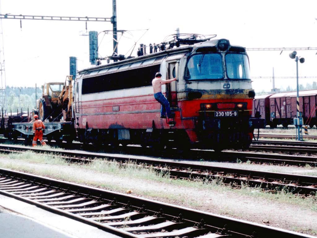 Unit 230 105-9 on arrival with a freight train in station Havlickuv Brod on 4/5/2002.