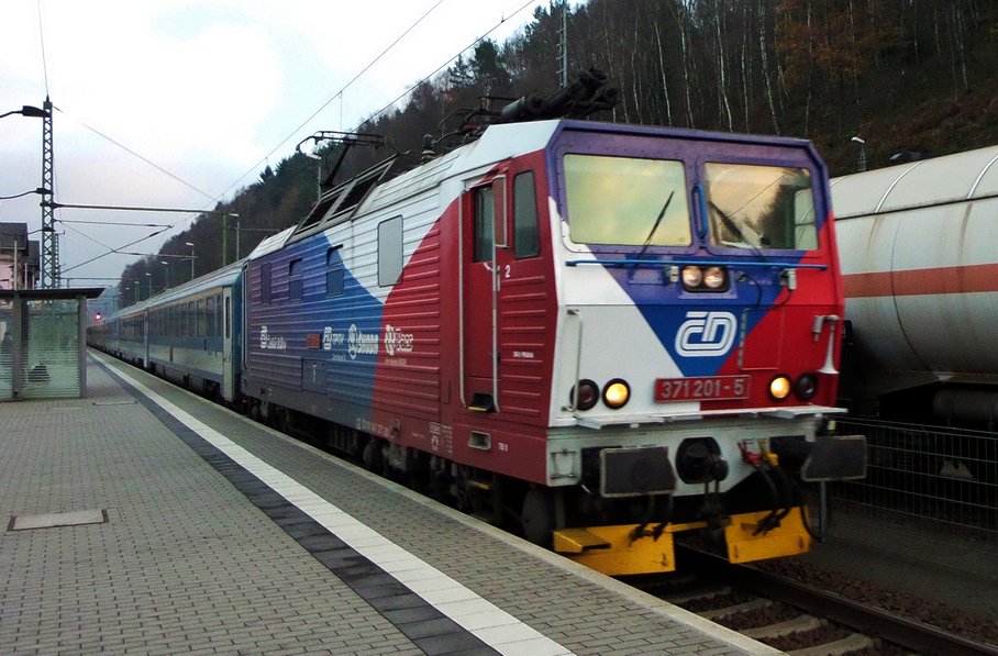 | CZ-CD 91 54 7 371 015-9 (still painted in the old livery that it received when rebuilt from class 372) brought EC 172 Vindobona (Villach - Hamburg) from Praha hl.n. to Dresden Hbf, 2014-09-22. |
