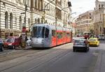 Straßenbahn Praha - 9118 Triebwagen 9118 auf Linie 14 beim Bahnhof Praha Masarykovo, aufgenommen am 20. Oktober 2011.