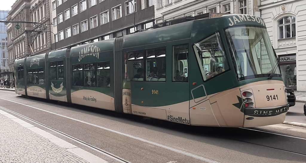 Praha 14T (Skoda Elektra) 9141 with full advertisement "Jameson" at Karlovo Namesti stop. August 2019. Photo by M.Koblischka |