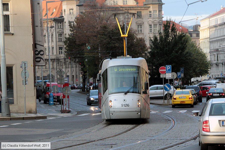 Straßenbahn Praha - 9126 Triebwagen 9126 auf Linie 9 nahe der Haltestelle Hlavní nádraží, aufgenommen am 20. Oktober 2011.