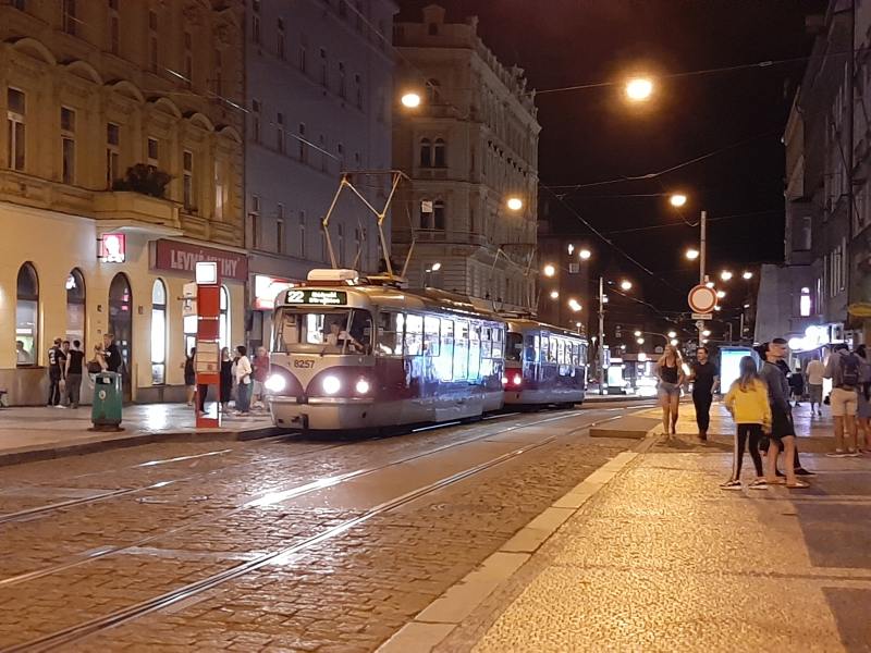 Trams queued-up at Karlovo namesti due to the tracks being blocked. There are several types recognisable along classic Tatra T3 models, like a KT8D5.RN2P, a T6A5 and a T3R.PLF (from right to left).