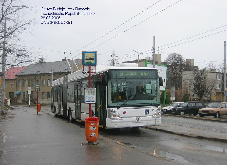 | IMG 2867 Budweis 26.03.06 O-Bus 58, Linie 9, an der Endstelle "Suché Vrbné - tocna". Der Zustieg der Fahrgäste zeigt, daß die Fahrt zur anderen Endstelle "Vltava - tocna" unmittelbar bevorsteht. Dr. Sternol, Eckart (Foto), Eckart.Sternol@bahn.de |