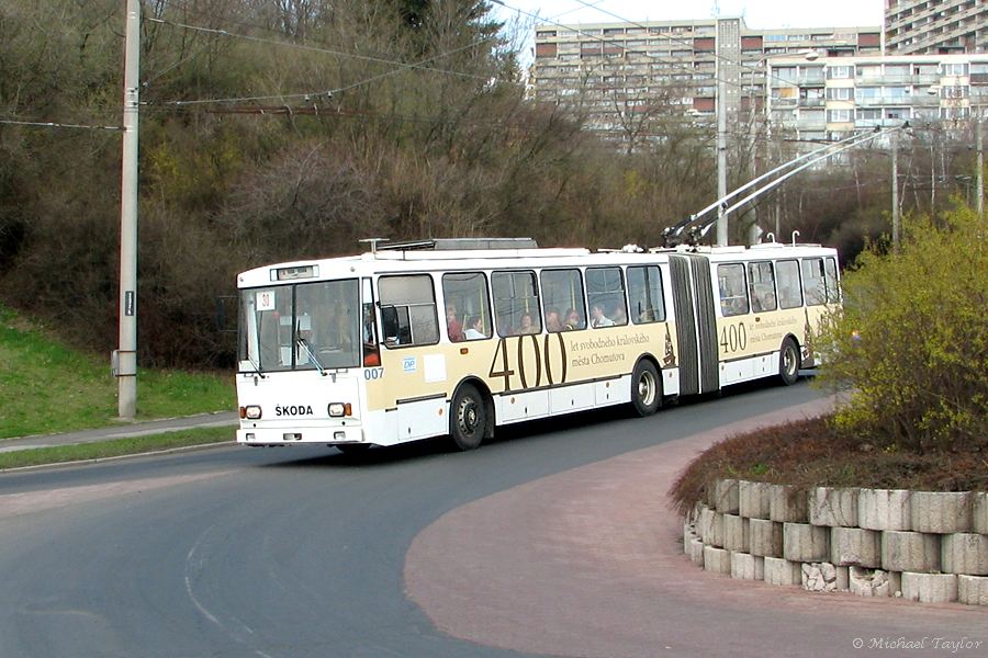 Chomutov. Škoda 15Tr11/7, number 005 with a route 20 service along Kamenná ulice on Friday September 7th, 2007. This trolleybus carries advertising livery on only 1 side.