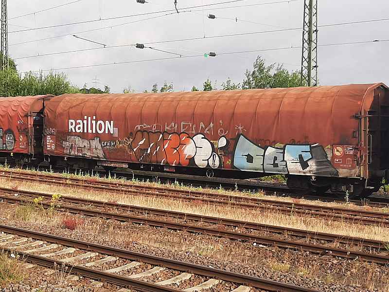 Railion Rilns mit roter Plane und Graffiti in St.Ingbert. Juni 2022.