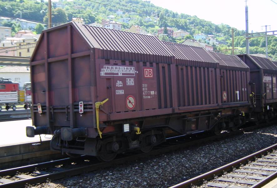 DB freight wagon Shimmns (steel transport) in a block train at Bellinzona, 2001/08/21;