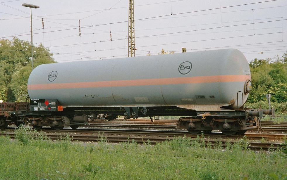 Private tank car transporting liquid pressurized gas, no. 33 80 791 5 329-6 [P], owned by the company VTG-Lehnkering AG using the brand "Eva" (formerly Eisenbahn-Verkehrs-Aktiengesellschaft).