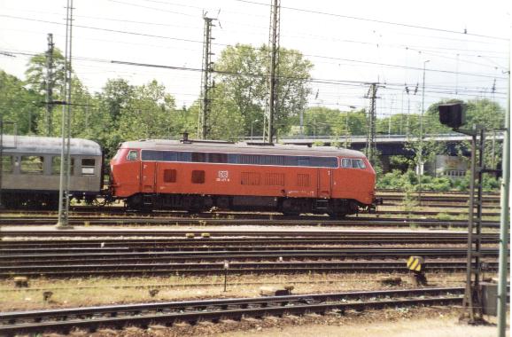 A locomotive class 218 with a regional train was seen in Koblenz Hbf in april 1999.