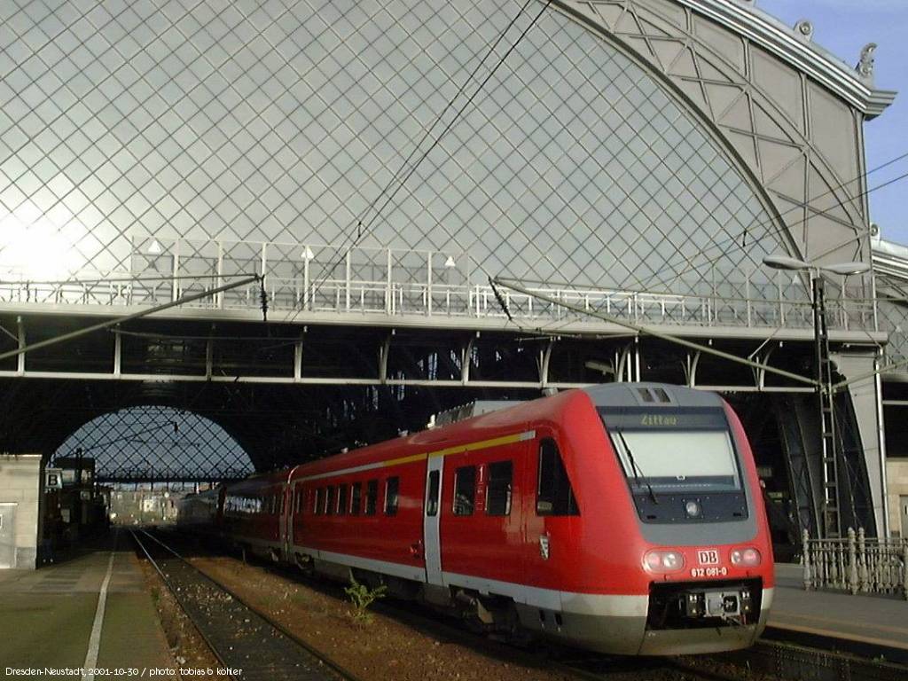 DB 612 019-0 (zweiter Triebwagen) fährt zusammen mit dem 612 582-7 (erster Triebwagen) bald als RE von Zittau nach Dresden Neustadt ab. Die Anzeige Dresden Hbf ist falsch. 2001-09-15