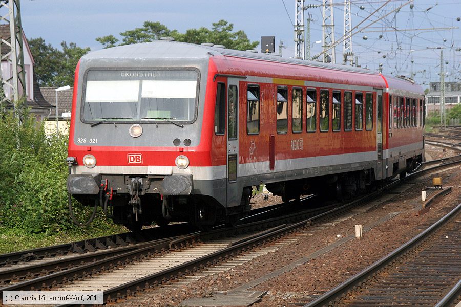 Deutsche Bahn - 928 321 Dieses Bild zeigt den Steuerwagen 928 321 bei der Einfahrt nach Neustadt (Weinstraße) Hauptbahnhof. Die Aufnahme ist am 21. Juni 2011 entstanden.