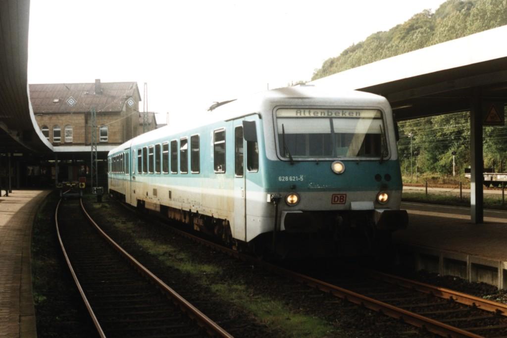 Unit 628 621-5 / 928 621-2 as local train RB 12202 (RB 82 Der Leineweber) from Altenbeken to Bielefeld at the railway station of Altenbeken on 13-10-2001. Photo and scan by Date Jan de Vries (email: datedevries@hotmail.com). |