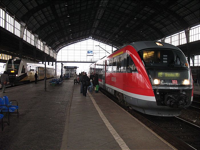 DB DMU 642 041, Dresden Hbf DB diesel railcar 642 041 waiting at Dresden main station for departure to Wroclaw (Poland) as RE 17045 (departure time 17:31). 642 041 is housed in Dresden. Imagine the 'Dynamo' shouts in the main station when I took this photo. Dynamo Dresden beat FC Bayern München II with 2-0 in a 3rd league match on this afternoon. Photo taken Saturday 6 February 2010. Photo: Steffen Mokosch (Steffen.Mokosch@web.de) |
