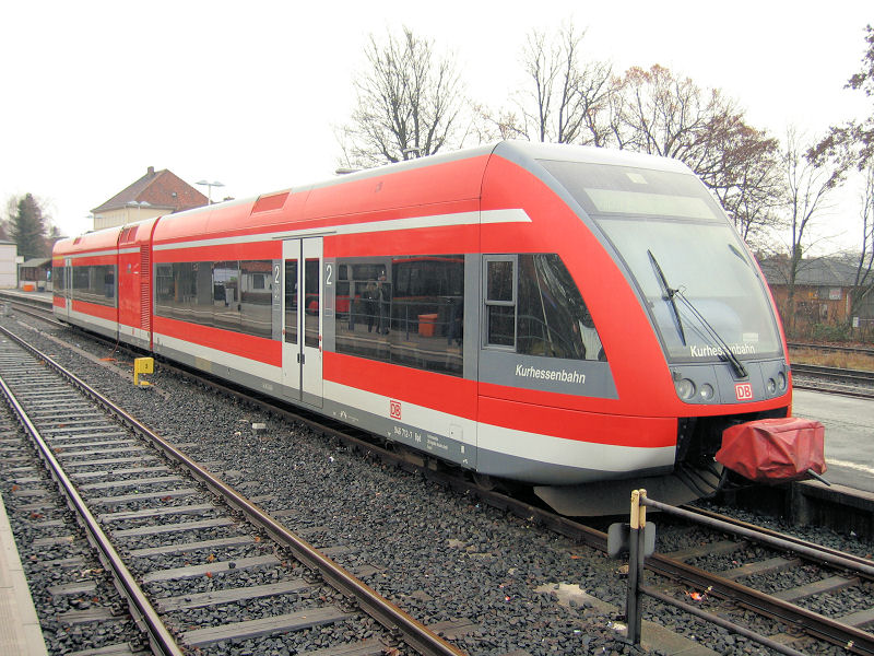 DBAG - Germany The Kurhessenbahn network (operated by DBAG) has recently received new diesel trainsets type GTW2/6 from Stadler in Switzerland. Here one of these sets is seen in Korbach Süd, the current terminal station on the line from Kassel. There are plans to reopen the line up to Frankenberg such that a through service to Marburg will be possible. Korbach Süd, 11/12/2004