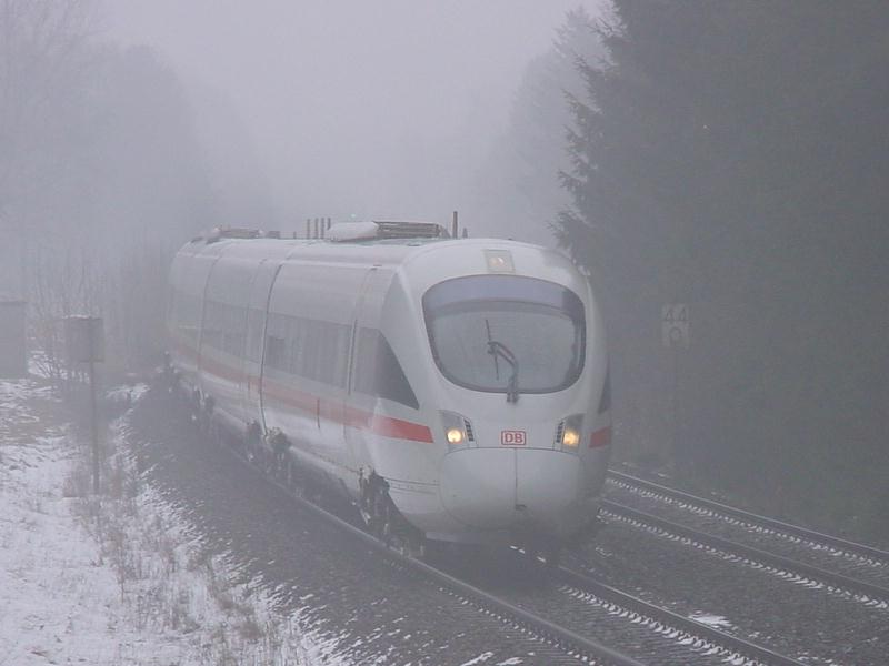 Eine IC-TD Doppeleinheit durchbricht die Nebelwand kurz nach der Durchfahrt des Bf Geltendorf im Rahmen des "verschärften" Betriebseinsatzes.