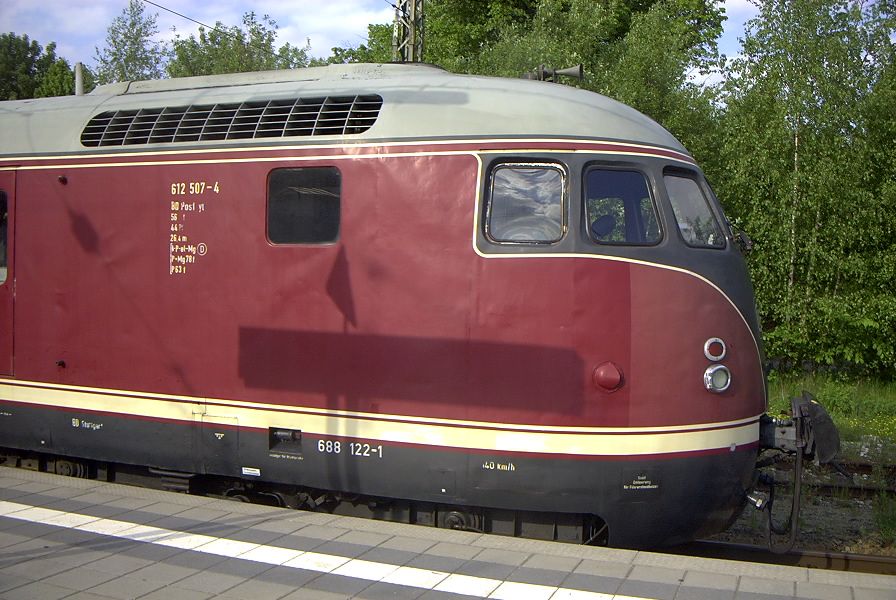 Museumszug 688 122-1 des DB-Museum Nürnberg, ehemals 612 507-4 als Sonderzug nach Stuttgart am 19.Mai 2001 im Bahnhof Prien am Chiemsee. Museum train 688 122-1 of German Railway Museum Nuremberg, former 612 507-4 as special train to Stuttgart on May, 19th 2001 at Prien am Chiemsee station.
