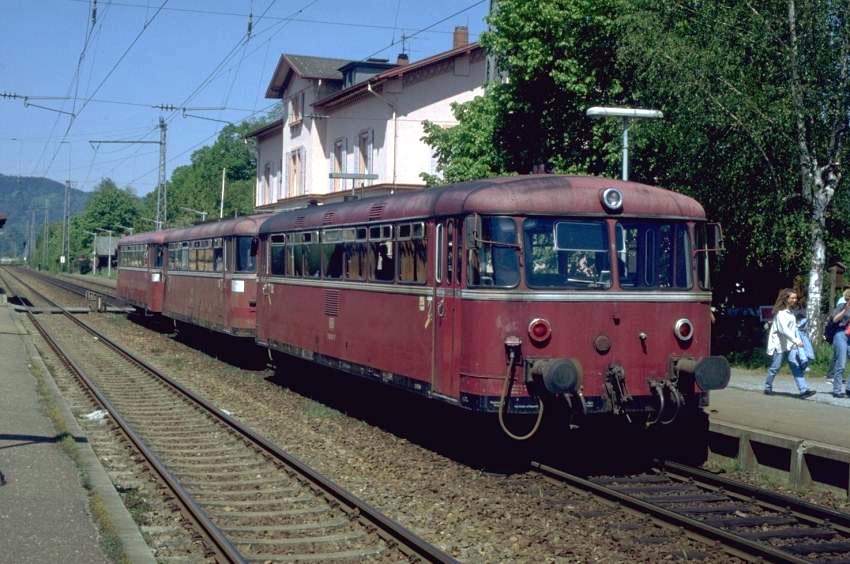 DB railcar "Schienenbus" (class VT 798) on a Hausach-Offenburg run in Biberach (Baden) on the Black Forest line Offenburg-Konstanz. This was the last season when "Schienenbus" railcars were in regular service around Offenburg. 3 May 1994.