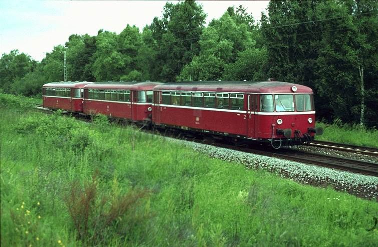 A triple unit of ex-DB railbuses on a special excursion. The leading unit is easily recognized by its characteristic advertisement as 798 818-1 of the private railway company Pfalzbahn, thus the trailers are presumably Pfalzbahn's 998 250-5 and 998 746-2.