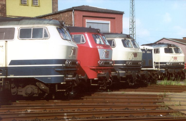 Mehrere Lokomotiven der Baureihe 216 und eine 212 präsentieren sich am 09.06.1996 an der Drehscheibe des Bw Limburg.