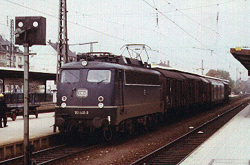 DB 110448-8 with a parcels train at Freiburg Hbf in October 1984