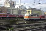 of Cologne. Many of the 111 are also used for the citys trains of Rhein-Ruhr. (21/09/97) Eine Elektrolokomotive der Baureihe 111, die 111 166-5 in S-Bahn-Lackierung (orange/grau), mit einem bunt gemischten RE auf dem Weg von Köln Hbf in Richtung Hansa-Ring. Viele Loks der BR 111 wurden in den 80ern für den S-Bahn-Verkehr im