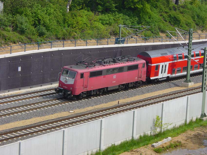 DB 111 010 in Frechen-Koenigsdorf. See my other pic from this engine in same possion on the other track. 08-May-2002. Photo by Michael Winklhofer (trainpic@winki.de) |