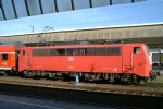 DB AG 111 DB Locomotive 111 100-4 in Orient-red livery waiting for its next duty to Germany, seen at Venlo on the 13th of July 1998.