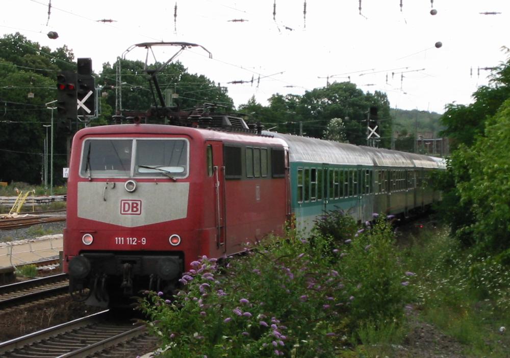 111 112-9 leaves Aachen Hbf with RE 10017 to Bielefeld on 9 July 2001.