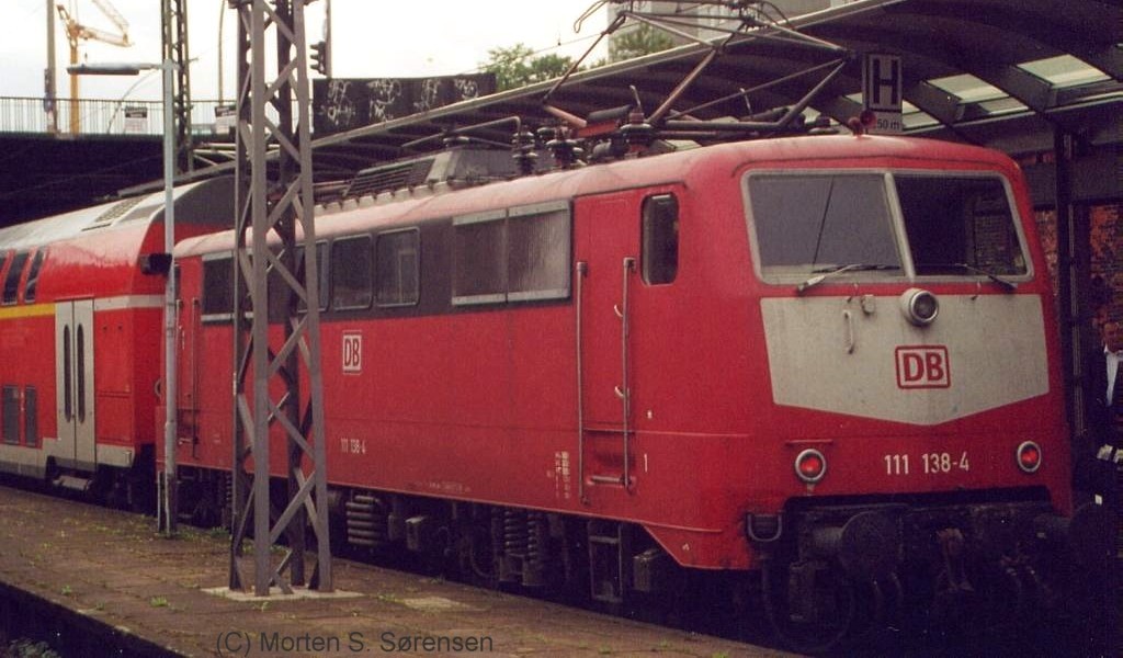 111 138-4 with an fast regional service (RE) in Hamburg Central station 2002.