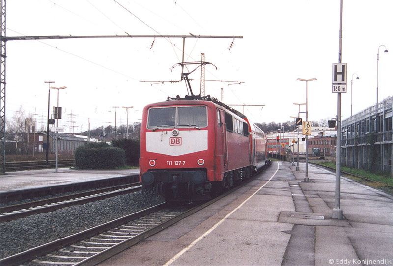 DB 111 127 is pushing RE 10319 (Aachen Hbf-Dortmund Hbf). Herzogenrath, 27-12-2002.